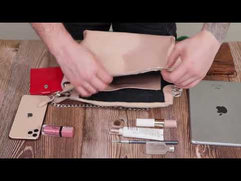 Сумку можно носить на плече благодаря регулируемому текстильному ремню или в руке — с помощью съёмной металлической цепочки.