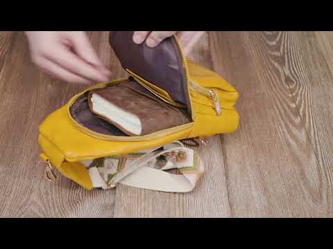 Слинг-сумка выполнена из эко-кожи в ярком жёлтом цвете. Модель оснащена одним основным отделением на молнии, внутри — карман на молнии и три отделения для карт.