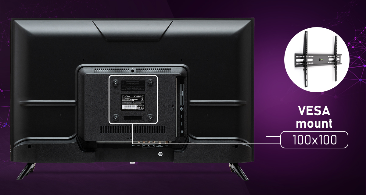 Vinga S32HD25B имеет глянцевый черный корпус, что идеально впишется в помещение с любым дизайном. Кроме того, вес телевизора без подставки – всего 3,6 кг. Вы без проблем сможете поставить его на тумбу или повесить на стену, воспользовавшись креплением VESA.