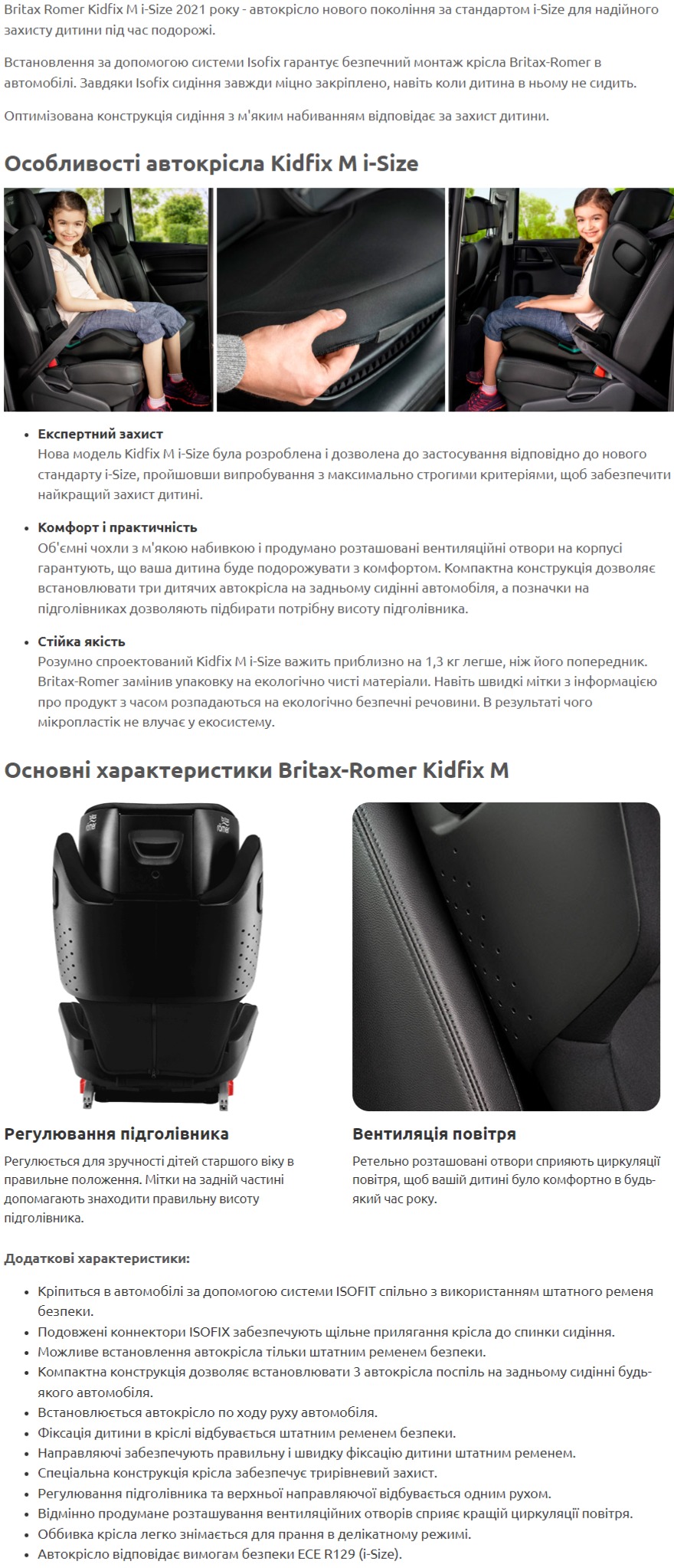 Автокрісло нового покоління KIDFIX M i-SIZE було розроблено у співпраці із провідними автовиробниками для захисту дітей у віці від 3,5 до 12 років. Модель відповідає новому стандарту i-Size, забезпечує високий ступінь безпеки та максимальний комфорт. Компактні розміри гарантують сумісність із більшістю моделей автомобілів, що ідеально відповідає потребам сучасної родини.