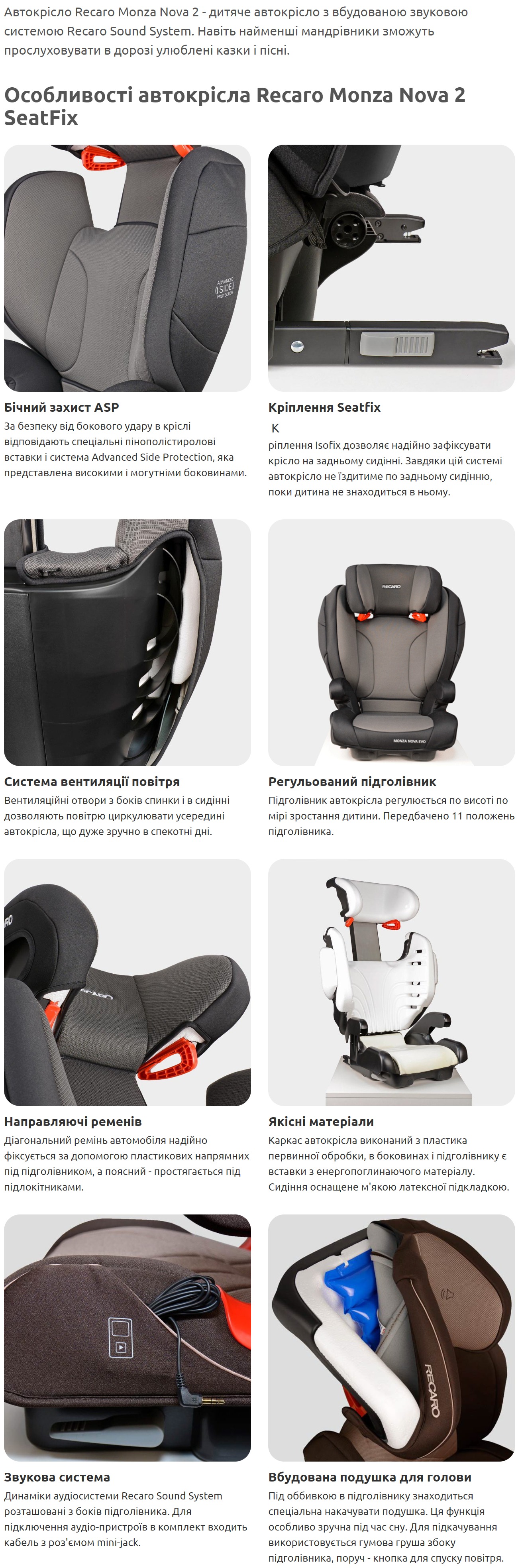 Автокрісло RECARO Monza Nova II SeatFix оснащено вбудованою платформою SeatFix, яка забезпечує швидку, легку і дуже жорстку фіксацію автокрісла в автомобілі. Вбудована в підголовник стерео-система Recaro Sound System створює додаткові умови для комфорту і служить додатковим елементом безпеки.