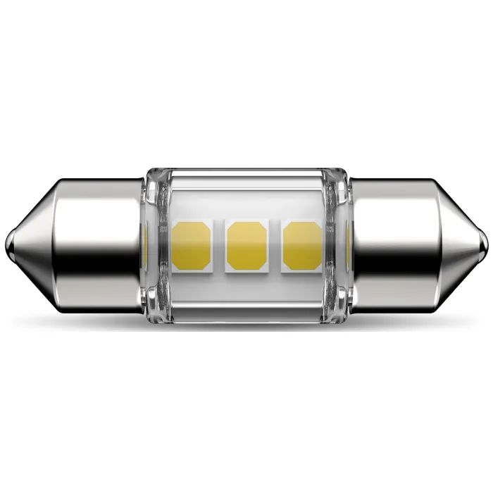 Тип - C5W, Вид - світлодіодна (LED), Цоколь - SV8.5, Призначення - сигнальний ліхтар відкритих дверей, підсвічування багажного відділення, підсвічування номерного знака, внутрішнє освітлення, світло для читання, бардачок, приборная панель, салон, Напруга - 12 В, Потужність - 1 Вт, Світловий потік - 100 лм, Колірна температура - 4000 K