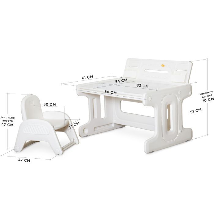Цей універсальний комплект — справжня знахідка для сучасних батьків! Створений із міцного посиленого пластику, він поєднує комфорт, функціональність і довговічність. Комплект складається з компактного стільчика (загальна висота 47 см, сидіння 30×31 см) та ергономічного столу (висота 51 см, ширина стільниці 54 см, довжина 83 см, загальна висота з панеллю — 70 см), що ідеально підходить для дошкільнят.