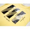 Літня футболка приємного ніжно-жовтого кольору, з принтовими написами і широкими смугами із красивих паєток з мереживним малюнком, для вашої юної модниці.