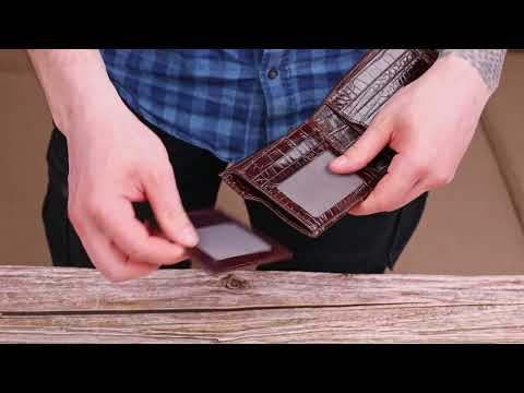 Функціональний гаманець для чоловіків з натуральної фактурної шкіри з тисненням під крокодила. Аксесуар має одне основне відділення з перегородкою, до якого вміщуються купюри всіх номіналів, дев'ять кишень для карток, дві з яких під сіточкою, монетницю на блискавці, п’ять прилеглих кишень, а також автономний блок для карт, який розташований в одній із прилеглих кишень. Закривається аксесуар хлястиком на кнопку. Колір фурнітури – срібло.
