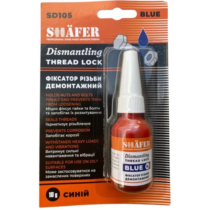 SHAFER SD105 - фіксатор, що запобігає мимовільному розгвинчуванню. різьбових з'єднань розміром до М36. SHAFER SD105 повністю заповнює поверхні різьби, забезпечуючи надійну фіксацію при крутному моменті у різьб М10 до 20 Нм. Після полімеризації SHAFER SD105 набуває чудову стійкість до вібраційних навантажень і відмінно підходить для використання при складанні двигунів, трансмісії, підвіски, а також вузлів спеціального і промислового устаткування. При необхідності з'єднання, може бути розібрано за допомогою ручного або пневматичного інструменту, а залишки засобу легко усуваються за допомогою металевої щітки. Відрізняється чудовою стійкістю до дії води, технічних рідин, мастил і палива, захищаючи з'єднання від корозійних процесів. SHAFER SD105 чудово герметизує і не допускає протікання повітря і рідин скрізь з'єднання.
