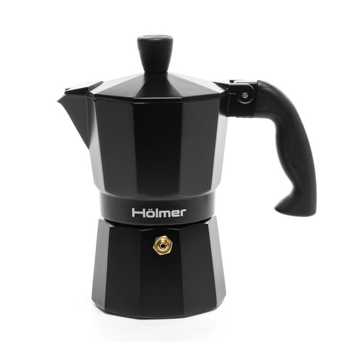 Сучасна гейзерна кавоварка Hölmer зроблена з високоякісного алюмінію, має чорний колір та зручну бакелітову ручку, яка не нагрівається. Кавоварка складається з двох ємностей, розділених спеціальним фільтром.