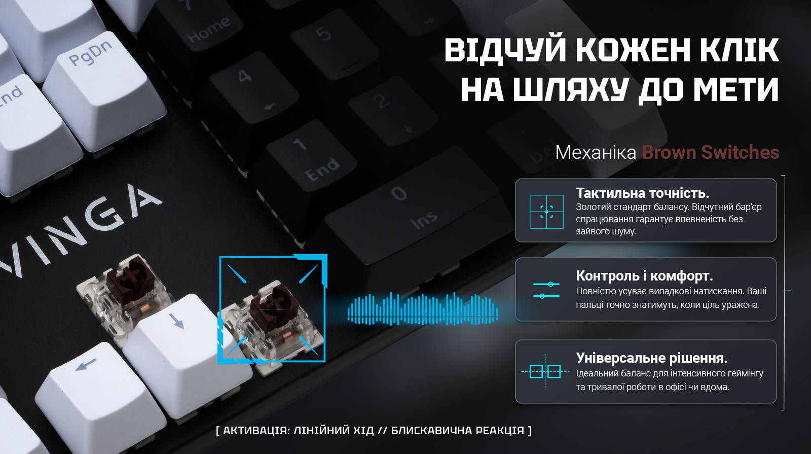 Перемикачі Brown Switches — це вибір раціональних геймерів, які цінують чіткий зворотний зв’язок без зайвого шуму. Кожне натискання супроводжується відчутним тактильним бар'єром, що дає змогу точно контролювати момент активації клавіші. Це ідеальне рішення для тих, хто поєднує інтенсивні ігрові баталії з активним набором тексту вдома чи в офісі. Ви отримуєте механічну точність і швидкість, зберігаючи при цьому акустичний спокій для оточуючих. Відчуйте кожну деталь гри кінчиками пальців, насолоджуючись плавністю та бездоганною реакцією вашого персонажа на будь-яку вашу команду.