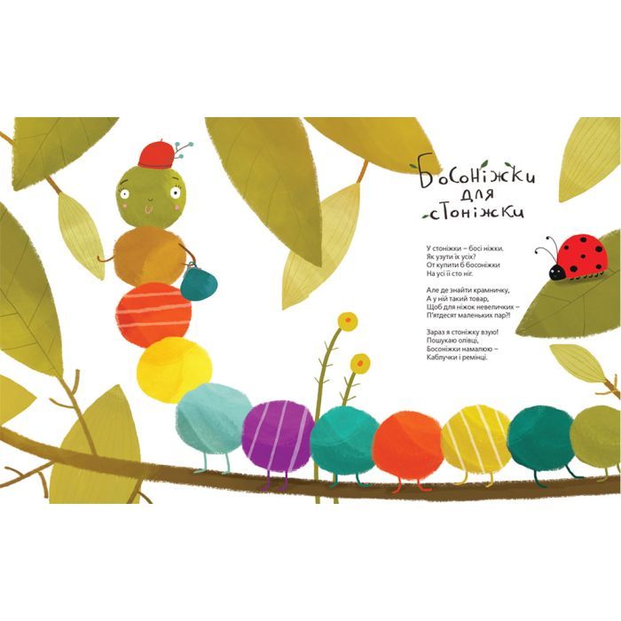 Добрі і веселі віршики про стоніжку, для якої потрібно купити півсотні пар взуття; про Мишку, яка, мріючи про нове хутерко, затягнула до своєї нірки… котячий хвіст; про Корову, яка навіть уміє вишивати; про маленького Равлика, про кота, акулу і лиса та багатьох інших звірят, яких намалювала художниця Юлія Пилипчатіна.