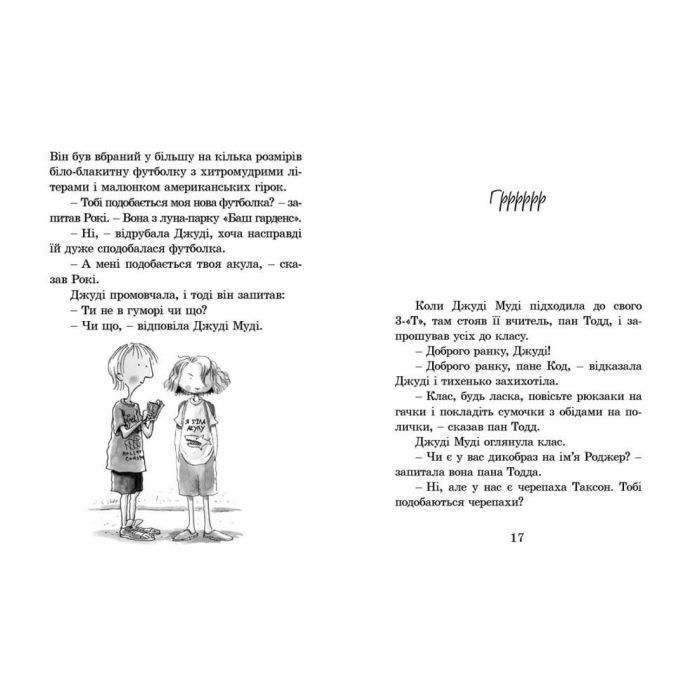 На вас чекає знайомство з кумедною дівчинкою на ім’я Джуди Муди, у якої частенько змінюється настрій. Він буває хороший, поганий, передшкільний, шкільний – який завгодно. А ще, у неї є молодший братик Стінк, найкращий друг Рокі та «заклятий» друг Френк Перл. Вони потрапляють у різноманітні пригоди, вчаться тішитися маленьким і великим радощам. А головне – вони неодмінно подарують усім читачам усмішку!