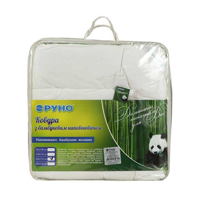 Тік – це тканина дуже щільного полотняного плетіння, виготовляється з натуральних волокон бавовни. Ця тканина ідеально підходить для пошиття чохлів на подушки і ковдри. Тік відрізняється особливою міцністю, зносостійкістю, також має позитивні якості, такі як екологічність і гіпоалергенність. Тканина піддається спеціальному просоченню, яка перешкоджає проникненню наповнювача назовні, а пилу всередину виробу. Ковдри та подушки з тіка більш пружні, прекрасно тримають форму, довговічні і мають високу гігроскопічність. Наповнювач: бамбукове волокно Бамбук – натуральний наповнювач, який виготовляється з волокон бамбукового дерева, основними перевагами якого є його натуральність і високі експлуатаційні властивості. Бамбукове волокно має протимікробний ефект і антибактеріальні властивості. Не викликає алергічних реакцій. Завдяки його структурі забезпечується відмінна мікроциркуляція повітря. Наповнювач не вбирає вологу і запахи. Ковдра з бамбуковим волокном легка і дуже ніжна на дотик, що забезпечить Вам комфортний і приємний сон. Вироби з таким наповнювачем можна прати, а їх доступна вартість допоможе Вам зробити вибір на користь таких виробів. Бамбукова ковдра "БКУ" ТМ Руно - демісезонна ковдра з антиалергенними властивостями на основі бамбукових і поліефірних волокон. Бамбукові волокна забезпечують дивовижну повітропроникність, відчуття приємної свіжості і легкості, волокна містять унікальні антибактеріальні та антигрибкові частки. Ковдри з бамбуковим волокном чудово підійдуть алергікам, так як в них не заводяться кліщі, вироби з таким наповнювачем благотворно впливають на організм, створюючи комфортні умови для повноцінного сну. Ковдра є в різних розмірах, доповнити комплект рекомендуємо бамбуковою подушкою ТМ Руно. Ковдри та постільні аксесуари від ТМ Руно поєднують в собі чудову якість пошиття, відмінний дизайн і експлуатаційні характеристики.