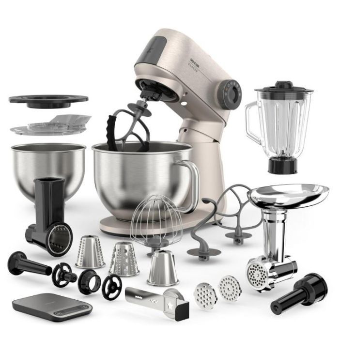 М'ясорубка для дрібного, середньо грубого і грубого помелу насадки обертаються навколо власної осі і одночасно навколо осі редуктора гарантує перемішування всього вмісту чаші без залишку дозволяє переробляти 100% об'єму чаші, ніж гарантує бездоганне перемішування продуктів. Насадка для виробництва ковбас, дві ширини.