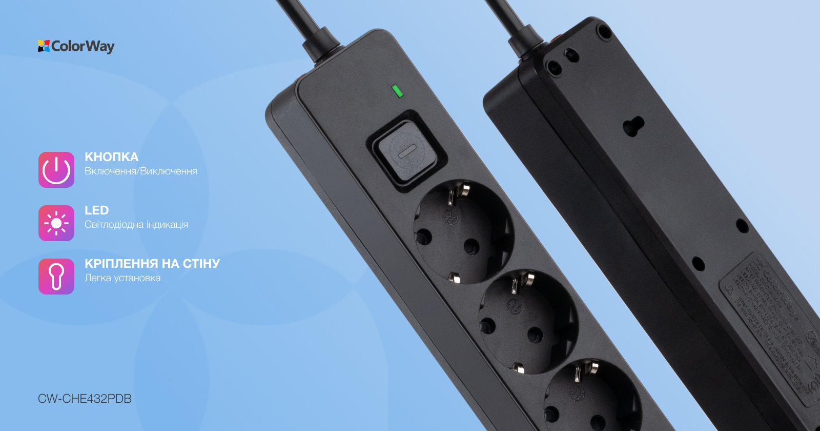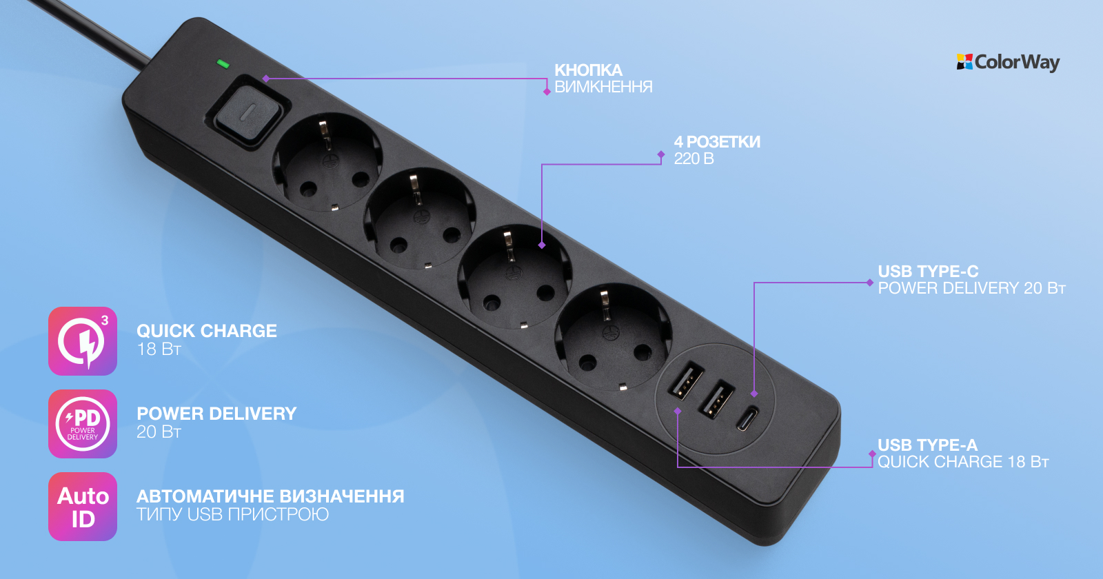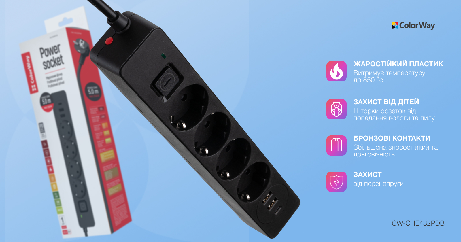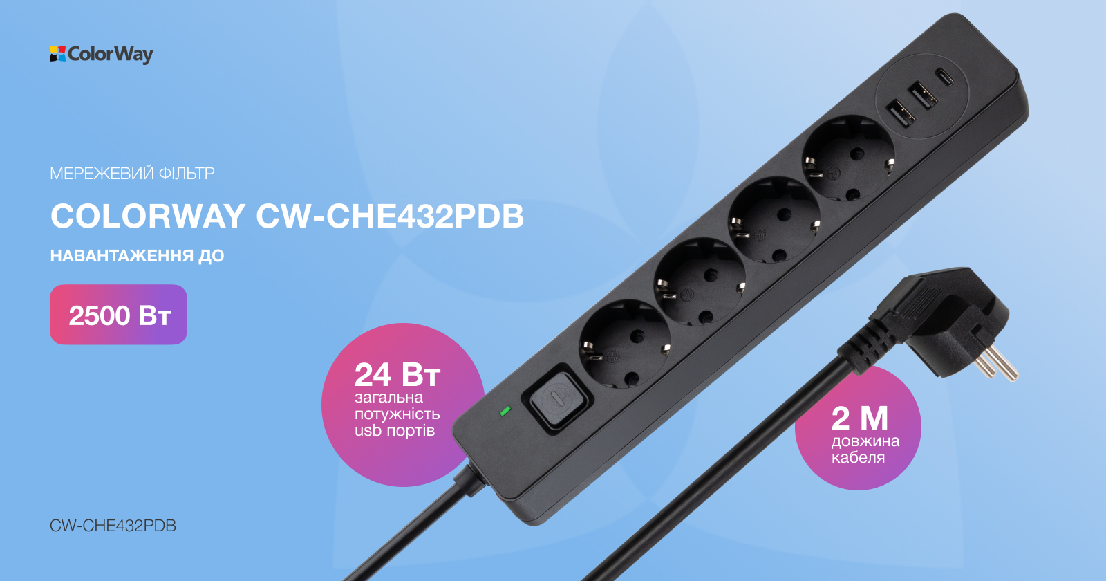Мережевий фільтр ColorWay CW-CHE432PDB містить чотири мережеві розетки 220В і три USB-порти. Захисні шторки на розетках забезпечують безпеку використання, а автоматичний розподіл енергії між USB-портами забезпечує ефективну зарядку пристроїв (до 24Вт). Два USB-порти підтримують швидку зарядку Quick Charge 3.0, а третій порт USB-C PD підтримує швидку зарядку для Apple пристроїв. Зручна кнопка ввімкнення/вимкнення і світлодіодна індикація спрощують його використання. Подовжувач також обладнаний заземленням і захистом від перенапруги, що забезпечує безпечну роботу.