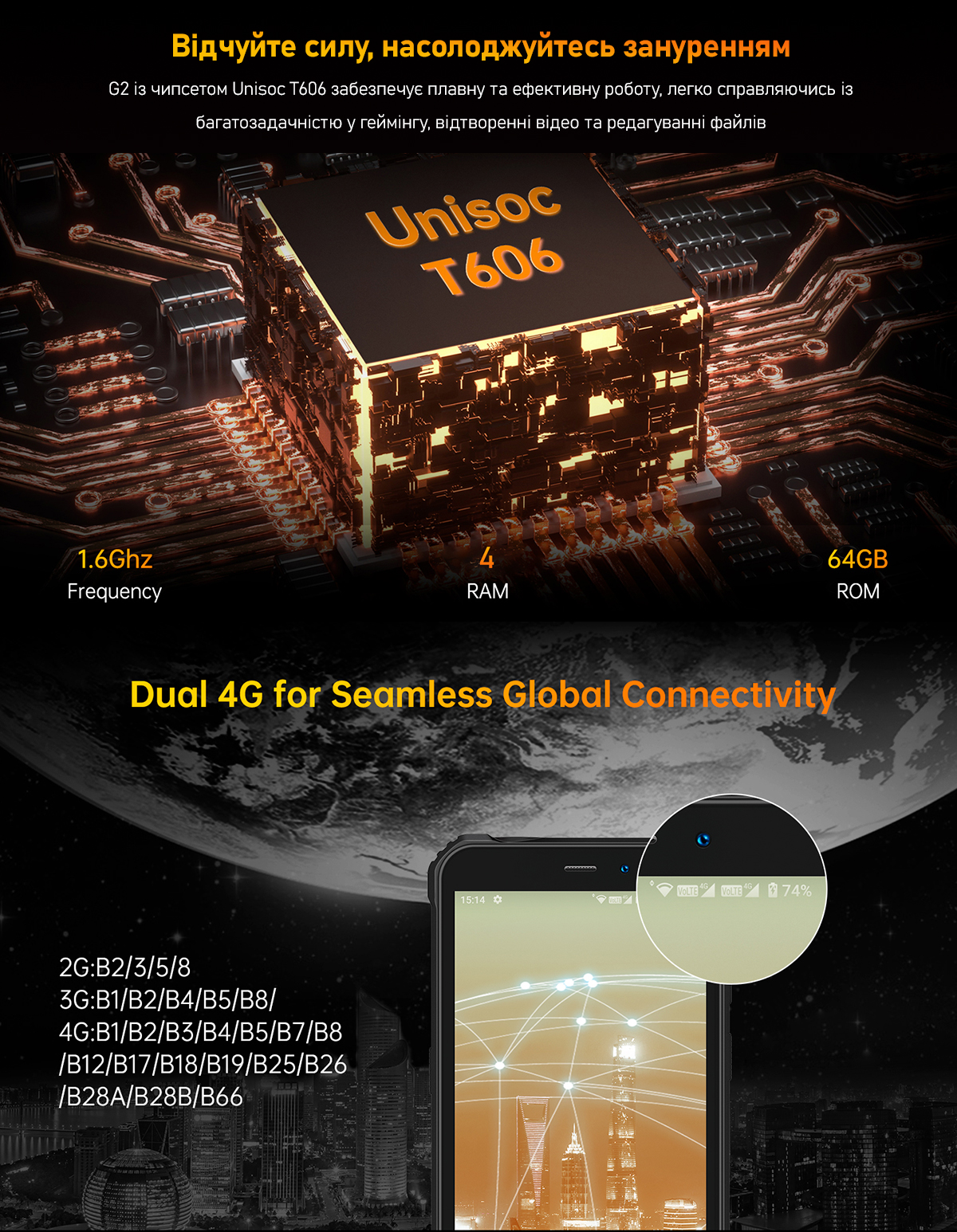 Відчуйте силу та насолоджуйтесь зануренням завдяки чіпсету Unisoc T606 (1.6 ГГц), який забезпечує плавну та ефективну роботу. Телефон G2 легко справляється із багатозадачністю – від геймінгу та відтворення відео до редагування файлів. З конфігурацією пам'яті 4 ГБ RAM та 64 ГБ ROM у вас буде достатньо ресурсів. Крім того, підтримка Dual 4G гарантує Seamless Global Connectivity (безперебійний глобальний зв'язок) завдяки широкому спектру підтримуваних частот 2G, 3G та 4G (Bands: B1/B2/B3/B4/B5/B7/B8/B12/B17/B18/B19/B25/B26/B28A/B28B/B66).