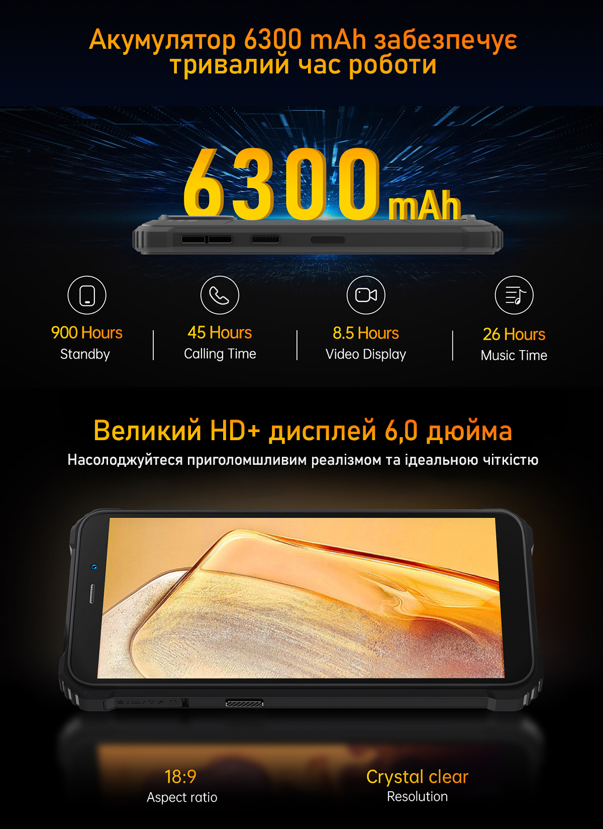 Отримайте тривалий час роботи завдяки потужному акумулятору на 6300 мАг, який забезпечує до 900 годин у режимі очікування, 45 годин розмов, 8,5 годин перегляду відео або 26 годин прослуховування музики. Насолоджуйтесь приголомшливим реалізмом та ідеальною чіткістю на великому HD+ дисплеї 6,0 дюйма. Завдяки співвідношенню сторін 18:9 і кришталево чистій роздільній здатності (Crystal clear Resolution), цей екран гарантує чудове візуальне сприйняття в будь-якій ситуації.