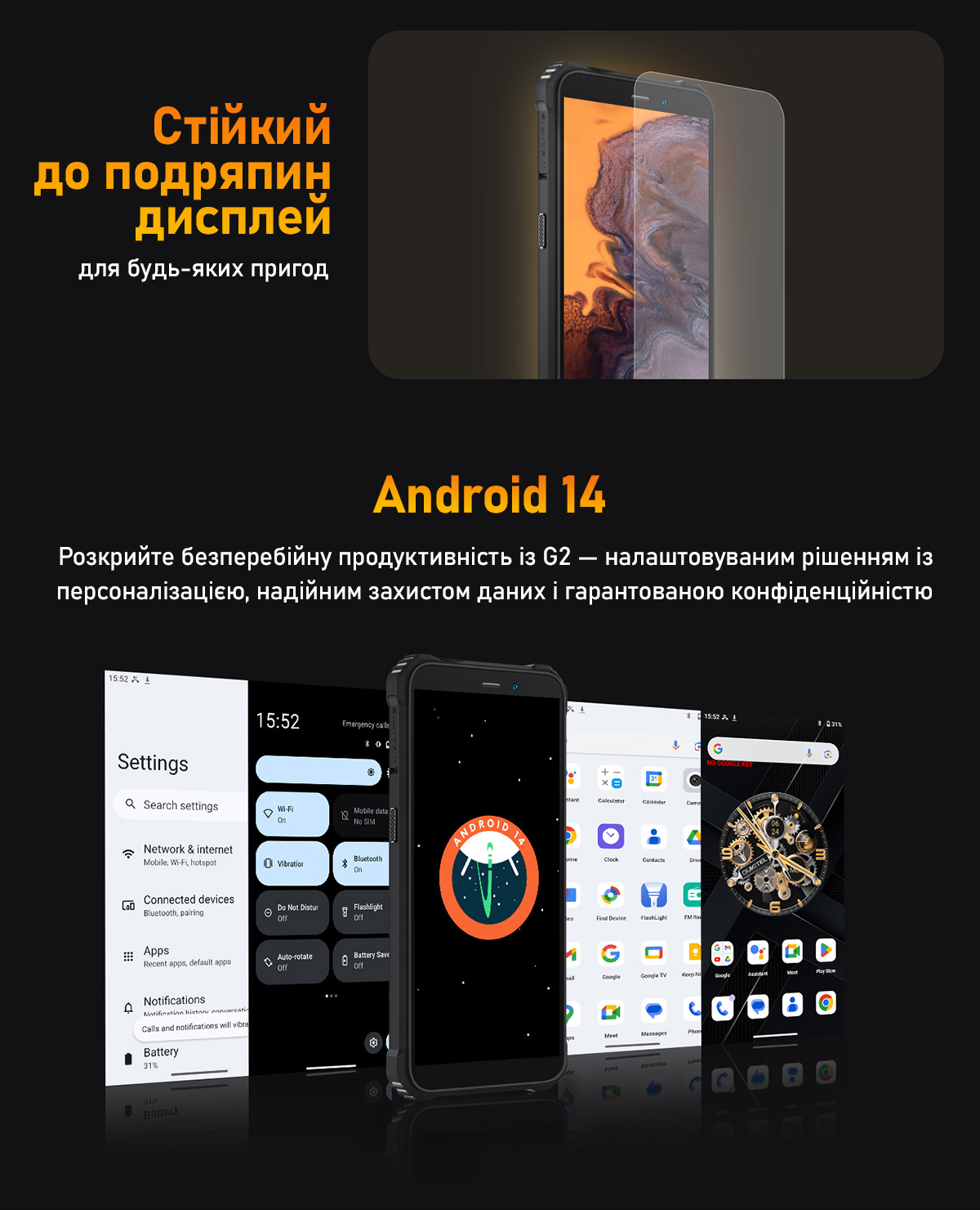 Стійкий до подряпин дисплей телефону G2 готовий до будь-яких пригод, забезпечуючи надійний захист екрана в найекстремальніших умовах. У поєднанні з операційною системою Android 14 ви розкриєте безперебійну продуктивність — це налаштовуване рішення з пріоритетом на надійний захист даних та гарантовану конфіденційність. Інтуїтивно зрозумілий інтерфейс та розширені функції безпеки роблять роботу з G2 не лише продуктивною, а й безпечною.