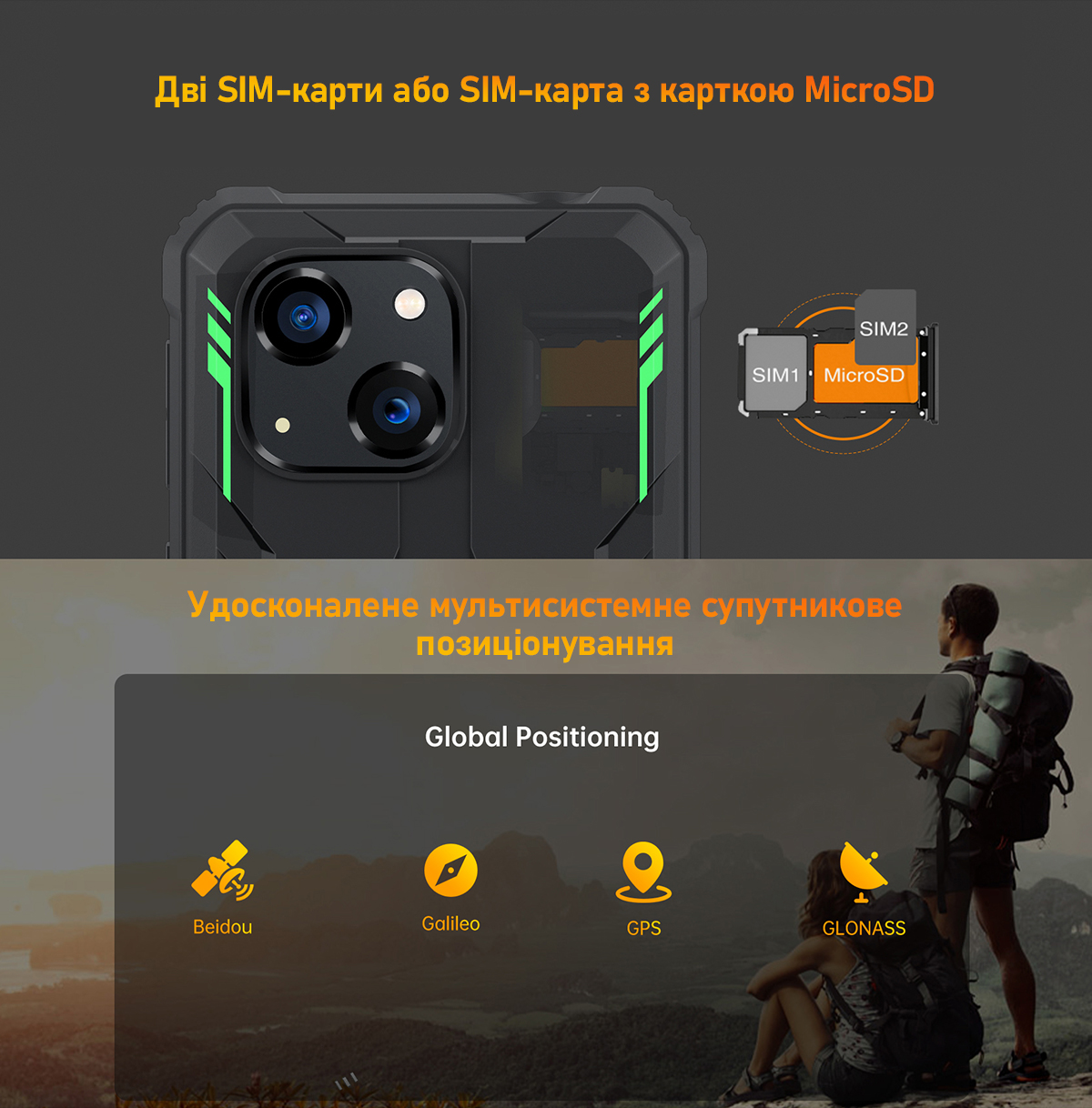Смартфон Oukitel G2 пропонує гнучкість у використанні завдяки підтримці двох SIM-карток або комбінації SIM-карти з карткою MicroSD для розширення пам'яті, дозволяючи вам легко керувати особистим та робочим зв'язком або збільшувати простір для файлів. Для забезпечення точності в будь-якій подорожі G2 оснащений удосконаленим мультисистемним супутниковим позиціонуванням. Підтримка систем Beidou, Galileo, GPS та GLONASS гарантує Global Positioning (глобальне позиціонування) з високою надійністю та точністю, незалежно від вашого місця розташування.