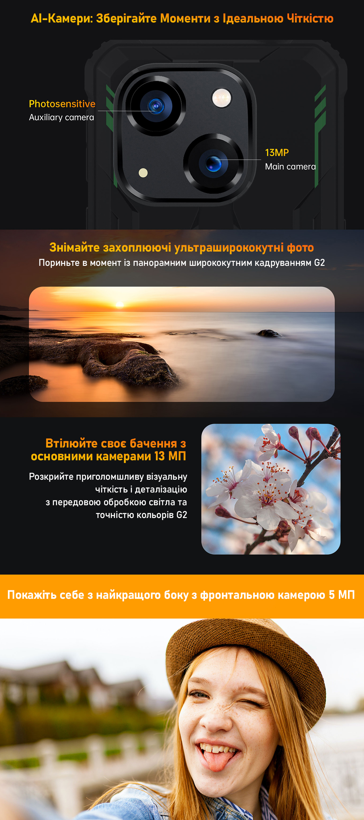 З AI-камерами Oukitel G2 ви зможете зберігати моменти з ідеальною чіткістю. Основний модуль на 13 МП разом із світлочутливою допоміжною камерою (Photosensitive Auxiliary camera) дозволяють втілити ваше бачення через приголомшливу візуальну чіткість і деталізацію завдяки передовій обробці світла та точності кольорів. Ви також можете знімати захоплюючі ультраширококутні фото, занурюючись у момент із панорамним кадруванням G2. А для ідеальних автопортретів використовуйте фронтальну камеру на 5 МП, щоб показати себе з найкращого боку.