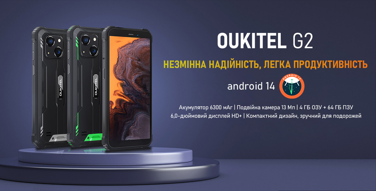 Завдяки міцному та компактному дизайну, смартфон Oukitel G2 є ідеальним вибором для тих, хто шукає незмінну надійність та легку продуктивність. Пристрій працює на базі Android 14 і оснащений потужним акумулятором на 6300 мАг, що гарантує тривалий час роботи. Він має 6,0-дюймовий HD+ дисплей, подвійну основну камеру на 13 Мп та конфігурацію пам'яті 4 ГБ ОЗУ та 64 ГБ ПЗУ, що робить його зручним для подорожей і щоденного використання.