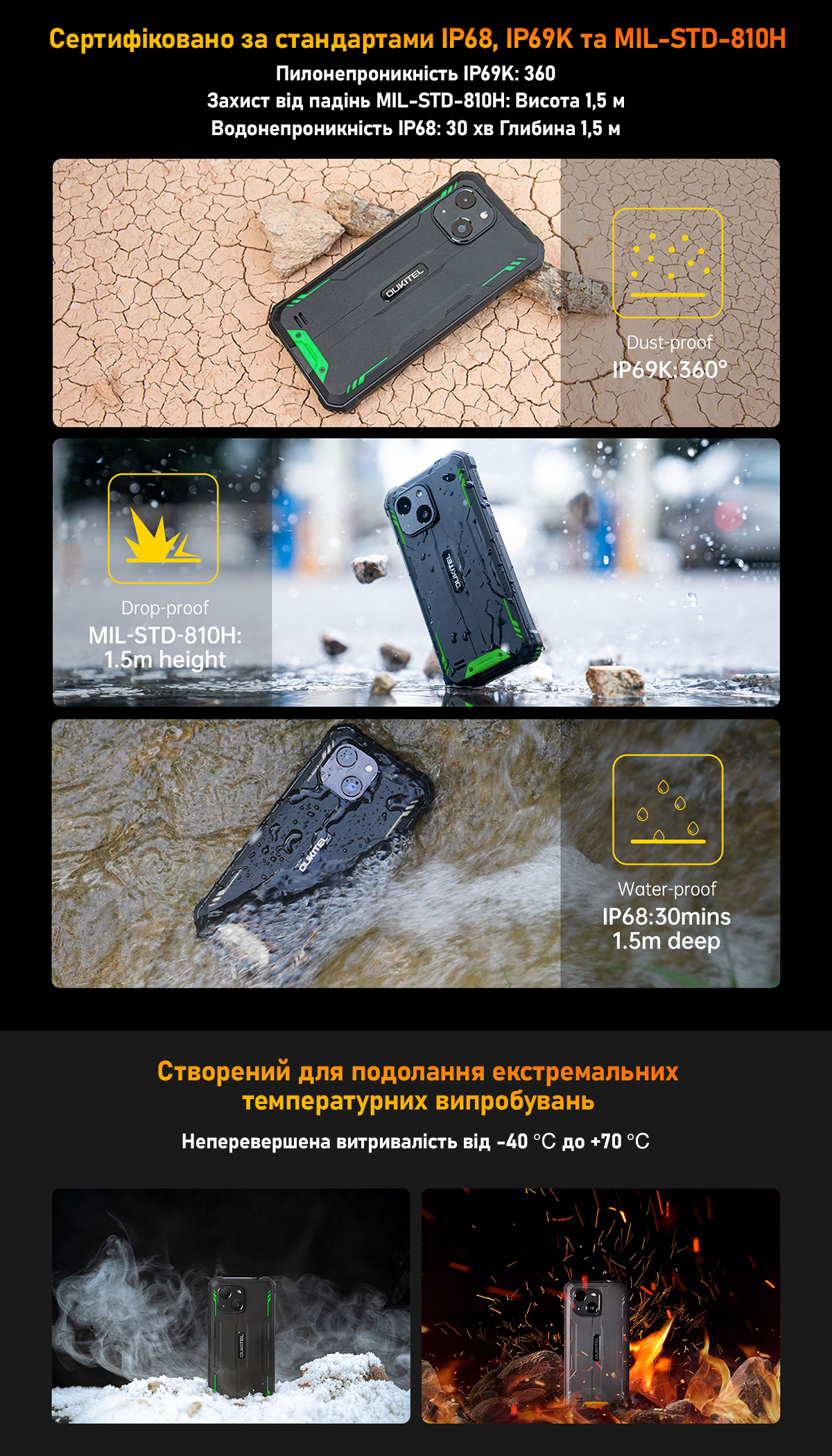 Смартфон Oukitel G2 сертифіковано за стандартами IP68, IP69K та MIL-STD-810H, що гарантує його неперевершену витривалість. Він забезпечує захист від падінь MIL-STD-810H з висоти 1,5 м, має пилонепроникність IP69K (360°) та водонепроникність IP68, витримуючи занурення до 1,5 м на 30 хвилин. Крім того, пристрій створений для подолання екстремальних температурних випробувань, демонструючи неперевершену витривалість в діапазоні від -40 °C до +70 °C. Це ідеальний супутник для будь-яких пригод.