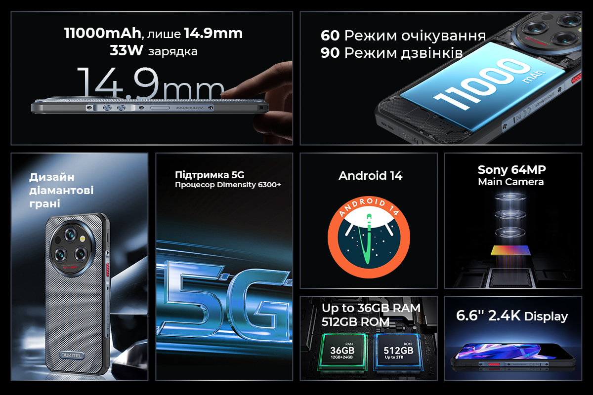 OUKITEL WP35 Pro переосмислює концепцію захищеного пристрою, поєднуючи статусний дизайн із «діамантовими гранями» та неймовірну витривалість. Це найтонший у світі захищений 5G-смартфон із товщиною всього 14.9 мм, у корпус якого інтегровано потужний акумулятор ємністю 11000 мА·год із підтримкою швидкої зарядки 33 Вт. Завдяки енергоефективному 6-нм процесору MediaTek Dimensity 6300+ та вражаючому обсягу пам'яті до 36 ГБ ОЗП, пристрій забезпечує бездоганну швидкість у мережах 5G та плавну роботу найважчих додатків. Великий 6.6-дюймовий дисплей із роздільною здатністю 2.4K та професійна основна камера Sony на 64 МП гарантують неперевершений візуальний досвід, роблячи цей смартфон ідеальним вибором як для ділових завдань, так і для активного відпочинку.