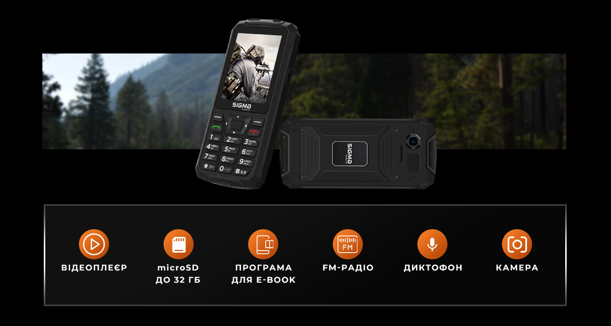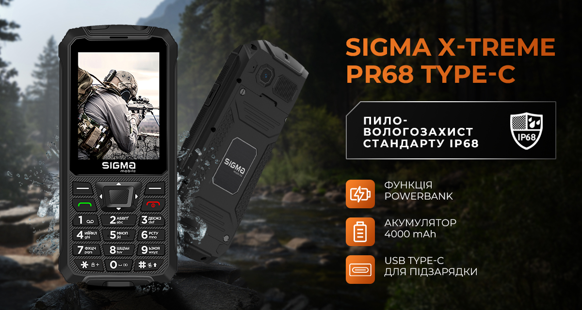 Sigma X-treme PR68 type-c — це захищений кнопковий телефон із функцією повербанка, створений для найекстремальніших умов. Він сертифікований за стандартом IP68, що гарантує повний захист від пилу, піску та бруду, а також витримує занурення у воду на глибину до 1,5 м протягом 30 хвилин. Завдяки додатковим ущільнювачам і міцним кріпленням, телефон демонструє високий рівень вібростійкості та довговічності.