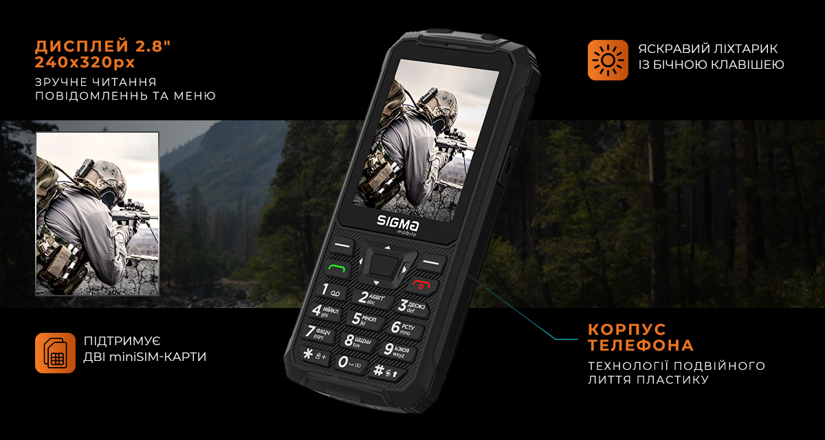Модель оснащена 2.8-дюймовим кольоровим дисплеєм із роздільною здатністю 240×320 пікселів, що робить користування меню та повідомленнями комфортним. Корпус виготовлений за технологією подвійного лиття пластику, що забезпечує міцність і захист від пошкоджень. Телефон підтримує роботу з двома міні-SIM-картами, що зручно для поєднання особистих і робочих номерів.