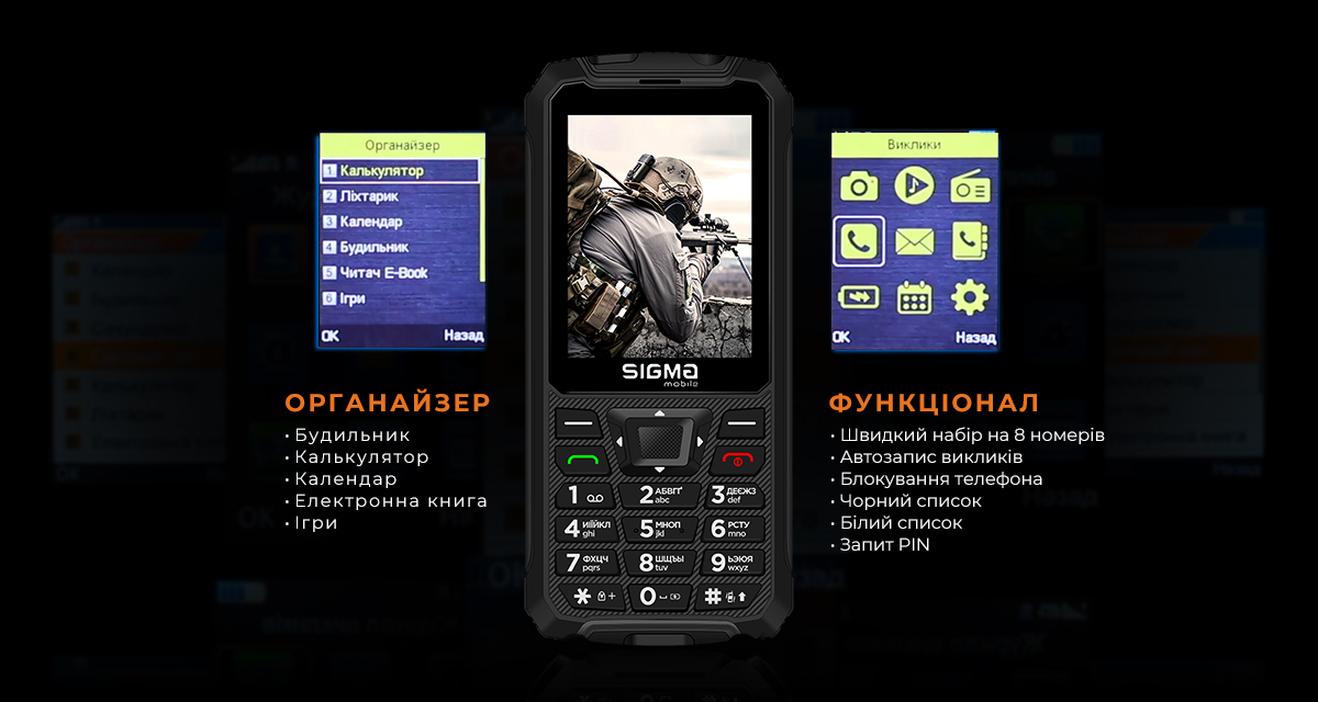 Sigma X-treme PR68 type-c стане надійним помічником завдяки вбудованому органайзеру, що включає будильник, калькулятор, календар, електронну книгу та ігри. Крім того, телефон подбає про вашу безпеку: підтримується швидкий набір на 8 номерів, автоматичний запис викликів, блокування пристрою, а також можливість створювати чорний і білий списки контактів. Додатковий захист забезпечує PIN-запит при ввімкненні телефону.