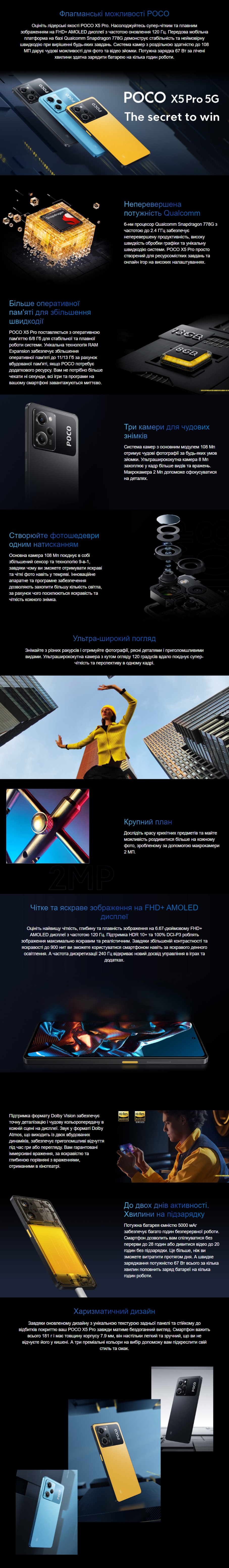 Оцініть лідерські якості POCO X5 Pro. Насолоджуйтесь супер-чітким та плавним зображенням на FHD+ AMOLED дисплеї з частотою оновлення 120 Гц. Передова мобільна платформа на базі Qualcomm Snapdragon 778G демонструє стабільність та неймовірну швидкодію при вирішенні будь-яких завдань. Система камер з роздільною здатністю до 108 МП дарує чудові можливості для фото та відео зйомки. Потужна зарядка 67 Вт за лічені хвилини здатна зарядити батарею на кілька годин роботи.
