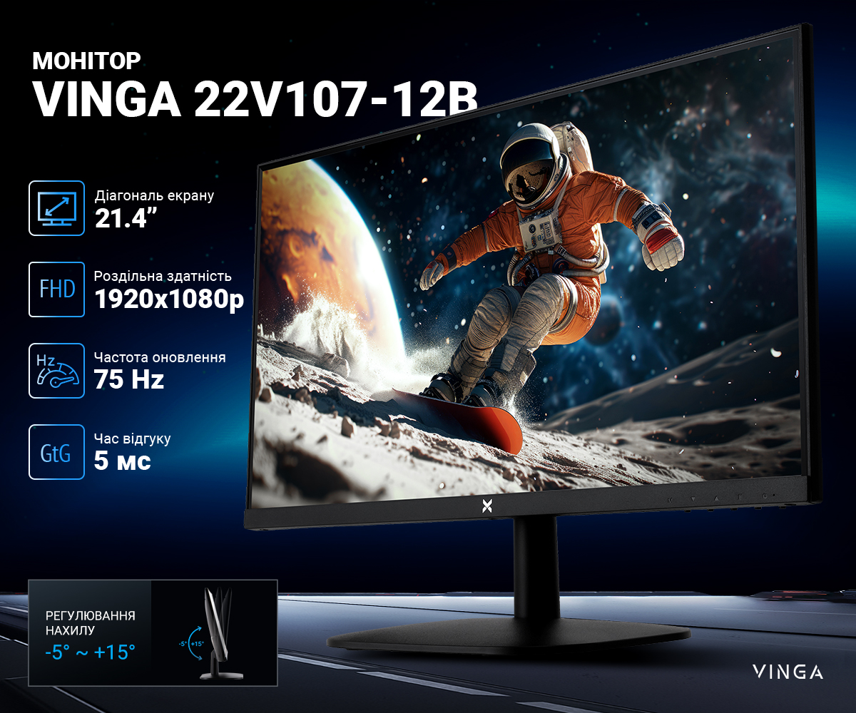 Монітор Vinga 22V107-12B — це ідеальне рішення для тих, хто цінує високу якість зображення та універсальність використання. Завдяки діагоналі 21.45 дюймів цей монітор пропонує чудовий баланс між достатнім розміром екрану для мультизадачності та зручністю розміщення на робочому столі.