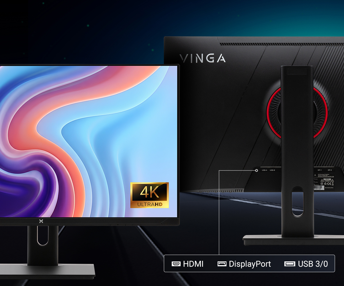 Компактність і зручність підключення роблять даний монітор ще привабливішим. Для вашої зручності Vinga 27S416-11B оснащений широким набором інтерфейсів: два порти DisplayPort, три USB 3.0, один USB Type-B і два HDMI. Це дозволяє легко підключати додаткове ігрове обладнання та різноманітні периферійні пристрої.
