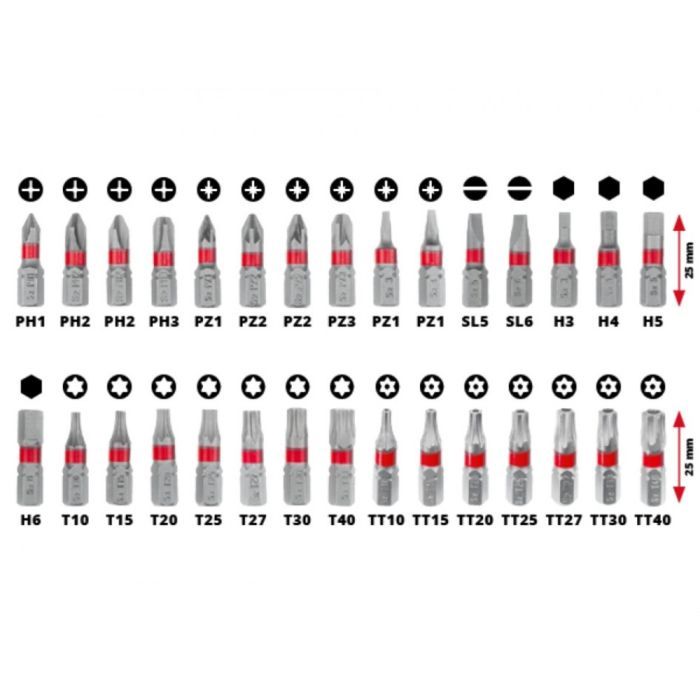- 30 біт (25 мм) з хвостовиком C 6.3, з піскоструминної сталі S2 сірого кольору PH1 / PH2 / PH2 / PH3 / PZ1 / PZ2 / PZ2 / PZ3 / SL3 / SL4 / SL5 / SL6 / H3 / H4 / H5 / H6 / T10 / T15 / T20 / T25 / T27 / T30 / T40 / TT10 / TT15 / TT20 / TT25 / TT27 / TT30 / TT40