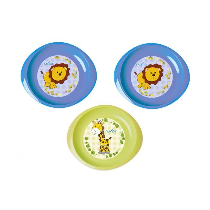 Набір яскравих та розвиваючих тарілочок від італійського бренду Nuvita. У наборі 3 пласкі тарілочки: 2 блакитного кольору та 1 салатового. Їх особливість – яскраві малюнки лева, жирафа та цифр, що відповідають кількості корон та листочків. Із таким набором дітлахи в ігровій формі навчаться основам математики. Тарілочки вироблені із міцного та безпечного пластику, що не містить бісфенол-А і фталати. Рекомендовано малюкам з 6 місяців.