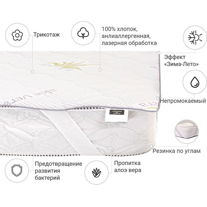 Завдяки просоченню алое вера наматрацник має вентилювальні, антибактеріальні, пом'якшувальні, регенерувальні та заспокійливі властивості, що створить комфортні умови для вашого сну.