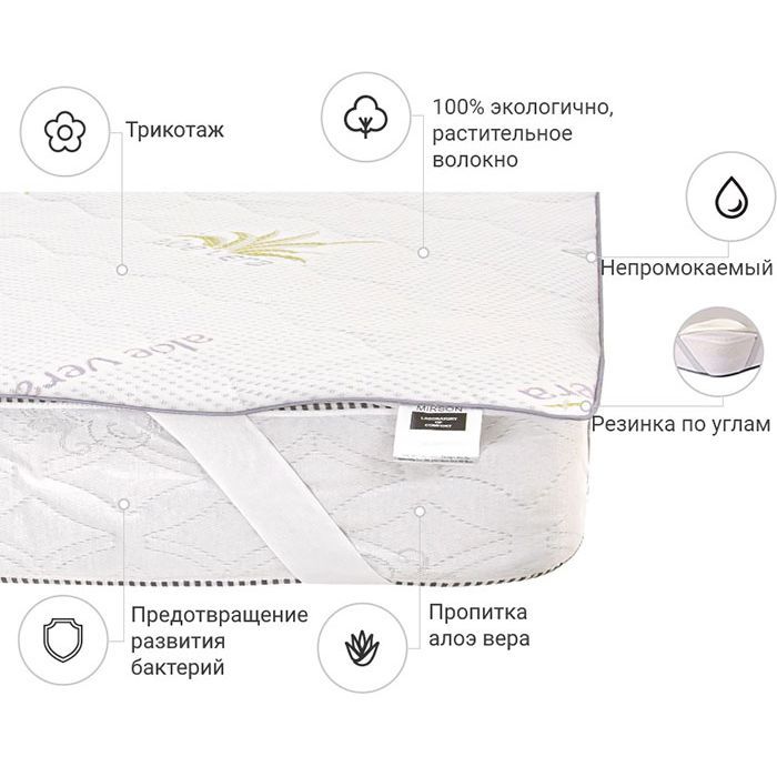 Завдяки просоченню алое вера наматрацник має вентилювальні, антибактеріальні, пом'якшувальні, регенерувальні та заспокійливі властивості, що створить комфортні умови для вашого сну.
