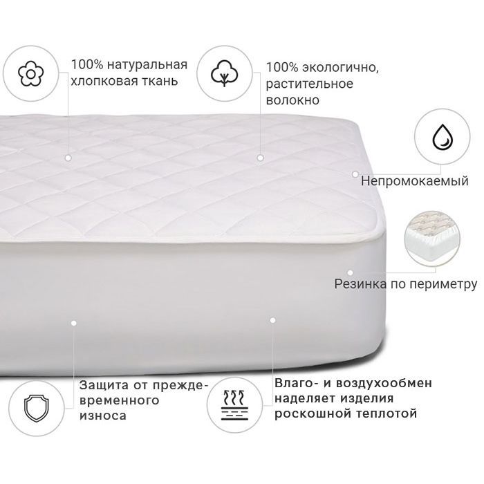 Розмір - 150 x 200 см, кріплення - з гумкою уздовж периметру, наповнювач - 70% бавовна, 30% поліефірний розпушувач, 100% бавовна, стьобаний, Колір - білий