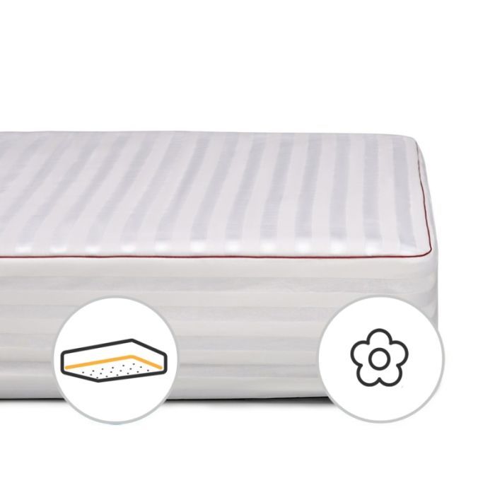 Наматрацник виготовлений із високоякісного матеріалу під назвою EcoSilk. Цей наповнювач славиться своїми поліпшеними показниками за рівнем відновлення, пружності, еластичності, м'якості та як результат довговічності. Сатинова тканина чохла має складне, жакардове переплетення, що надає наматрацнику не тільки естетичну вишуканість, але і збільшує міцність тканини загалом. Наматрацник дуже м'який, прекрасно сохне. Витримує більш ніж 200 прань.