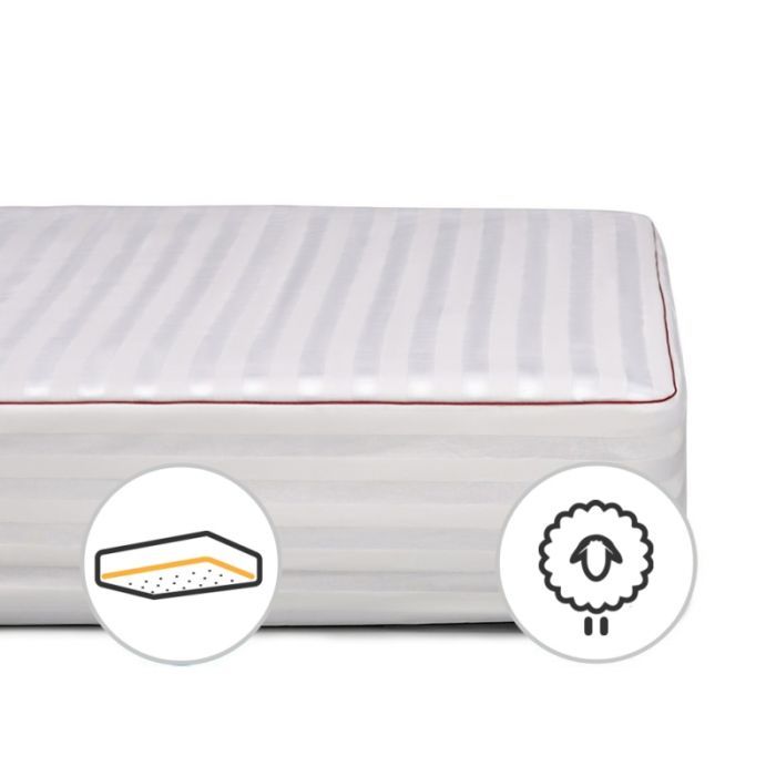 Наматрацник на гумці з високоякісної італійської тканини класу DeLuxe, яка довговічна, складається виключно зі 100% високоякісного бавовняного волокна. Сатинова тканина чохла має складне, жакардове переплетення, що надає наматрацнику не тільки естетичну вишуканість, але і збільшує міцність тканини загалом. Великим плюсом є те, що наматрацник має прекрасну терморегуляцію, саме тому під час сну не виникає "парникового ефекту". Ви не будете потіти, і зможете спокійно насолоджуватися чудовими снами впродовж усієї ночі.