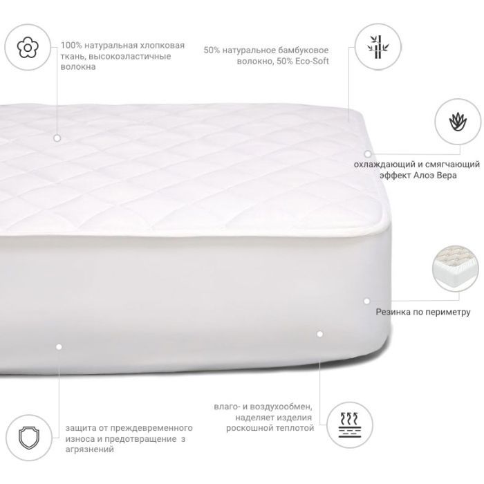 Розмір - 140 x 190 см, кріплення - з гумкою уздовж периметру, наповнювач - бамбукове волокно: 50%, поліефірний розпушувач: 50%, 100% бавовна, Колір - білий