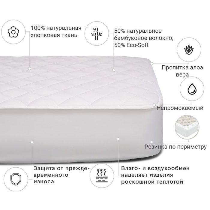 Розмір - 120 x 190 см, кріплення - з гумкою уздовж периметру, наповнювач - бамбукове волокно: 50%, поліефірний розпушувач: 50%, 100% бавовна, Колір - білий