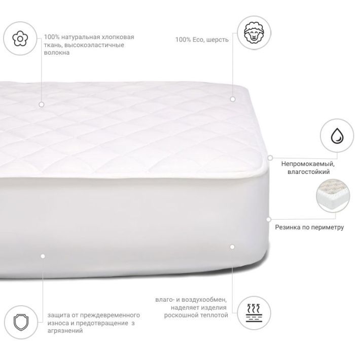 Розмір - 160 x 190 см, кріплення - з гумкою уздовж периметру, наповнювач - овеча натуральна вовна: 70%, поліефірний розпушувач: 30%, бавовна, Колір - білий
