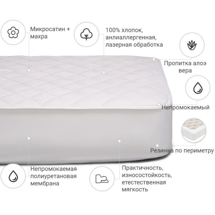 Розмір - 80 x 200 см, кріплення - з гумкою уздовж периметру, наповнювач - поліестер: 95%, штучне волокно: 5%., мікросатин + махра, Колір - білий