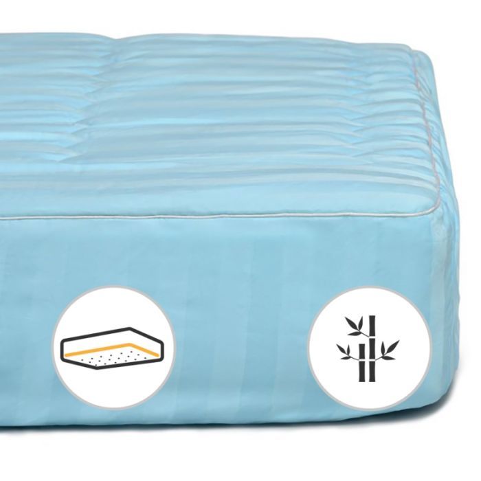 Розмір - 70 x 140 см, кріплення - з гумкою уздовж периметру, наповнювач - бамбукове волокно: 50%, поліефірний розпушувач: 50%, сатин жакард + мікросатин, Колір - блакитний