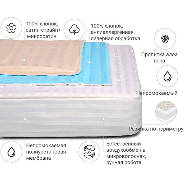 Двосторонній непромокальний наматрацник на гумці вздовж периметру з високоякісної італійської тканини. З одного боку — легка тканина мікросатин, яка забезпечить потрібну прохолоду в спекотні літні ночі, з іншого боку — 100% бавовняна тканина сатин, яка забезпечить вам тепло та затишок під час холодних зимових ночей.