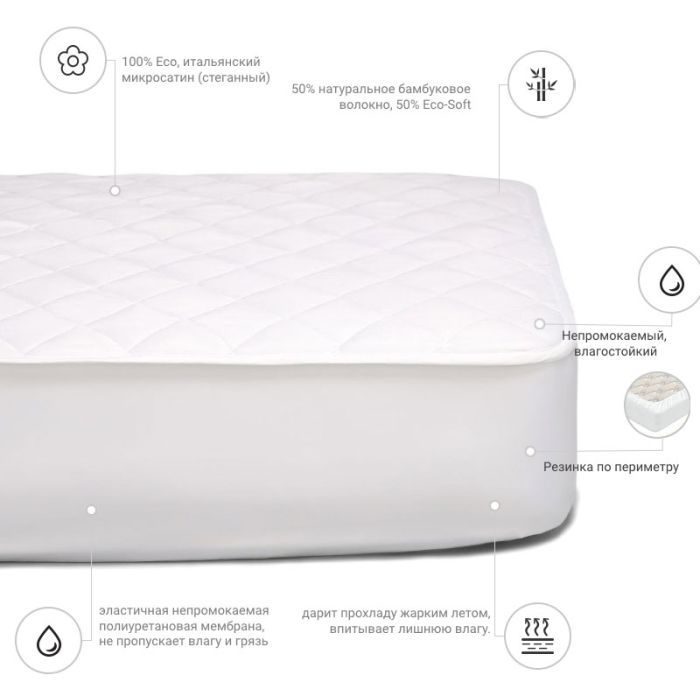 Сам наматрацник виготовлений із високоякісної тканини мікросатин — виробництва Італія. Наматрацник витримує понад 250 прань і водночас зберігає свій первісний вигляд. Тканина мікросатин — ніжна, приємна на дотик, сатинове плетіння забезпечує довговічність і м'якість усього виробу загалом. Наматрацник не ковзає по матрацу, добре фіксується.