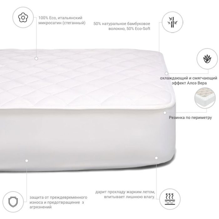 Сам наматрацник виготовлений із високоякісної тканини мікросатин — виробництва Італія. Наматрацник витримує більш ніж 250 прань і водночас зберігає свій первинний вигляд. Тканина мікросатин — ніжна, приємна на дотик, сатинове плетіння забезпечує довговічність і м'якість усього виробу загалом. Наматрацник не ковзає по матрацу, добре фіксується.