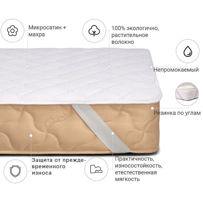 Розмір - 80 x 160 см, кріплення - з гумкою на кутках, наповнювач - 70% бавовна, 30% поліефірний розпушувач, мікросатин + махра, Колір - білий