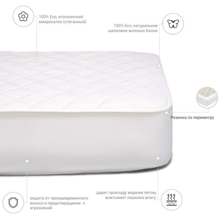 Сам наматрацник виготовлений із високоякісної тканини мікросатин — виробництва Італія. Наматрацник витримує понад 250 прань і водночас зберігає свій первісний вигляд. Тканина мікросатин — ніжна, приємна на дотик, сатинове плетіння забезпечує довговічність і м'якість усього виробу загалом. Наматрацник не ковзає по матрацу, добре фіксується.