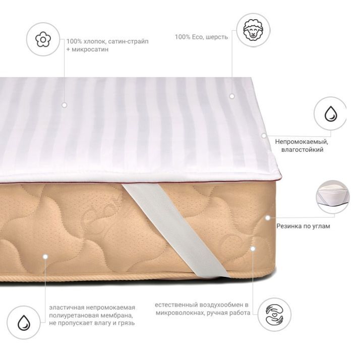 Розмір - 90 x 190 см, кріплення - з гумкою на кутках, наповнювач - овеча натуральна вовна: 70%, поліефірний розпушувач: 30%, сатин жакард, Колір - білий