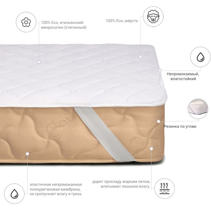Розмір - 80 x 160 см, кріплення - з гумкою на кутках, наповнювач - овеча натуральна вовна: 70%, поліефірний розпушувач: 30%, мікросатин, Колір - білий